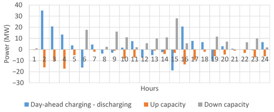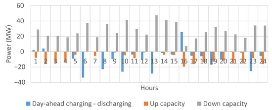 Battery charging day-ahead schedule () and up/down cleared reserve capacity and for the baseline case.