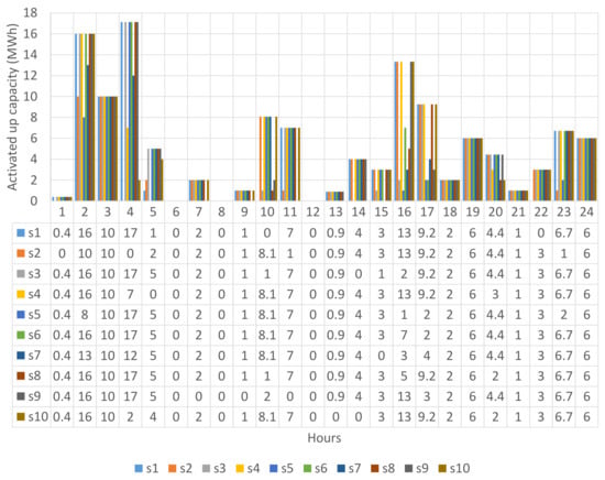 To better understand battery storage actions, the prices in different markets are shown in Figure 10. As shown in Table 1, the day-ahead prices are rather low throughout the day, taking the highest values in hours 19–24. The up capacity prices are zero (or slightly positive) throughout the day, which reflects the very low day-ahead market prices. The down capacity prices are much higher, reaching €93/MW in the afternoon hours. The up and down activation prices in Figure 10 are averaged over all scenarios. They are much higher than the day-ahead prices. Despite extremely low up reserve capacity prices, the activation prices are much higher. The peak price €235/MWh is achieved for up reserve activation in hour 16, which is the main reason for the battery storage reserving 13.3 MW of its up capacity and activating it fully in five out of ten scenarios.