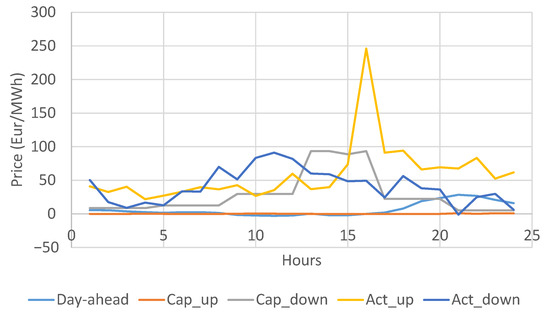 Prices in the day-ahead market (), up () and down () capacity reservation prices and up () and down () activated capacity prices.