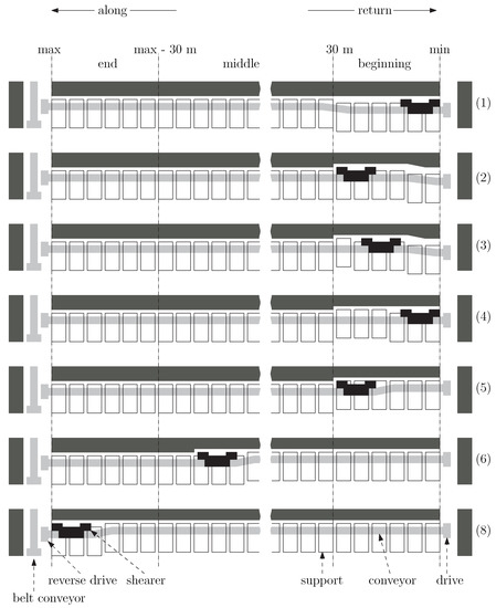 33]. Moving the support and conveyor follows the working shearer. Drive and reverse drive modes are performed at both ends of the longwall face.