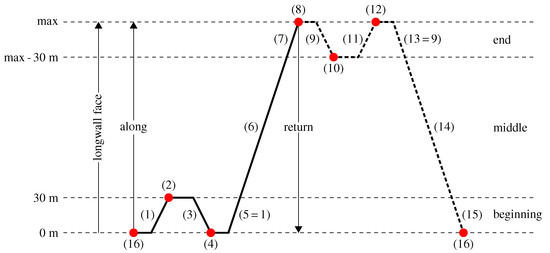 Figure 3 presents a description of the ideal shearer cycle with the denotation of general shearer position (beginning, middle and end of the longwall face) and enumerated process stages.