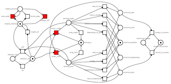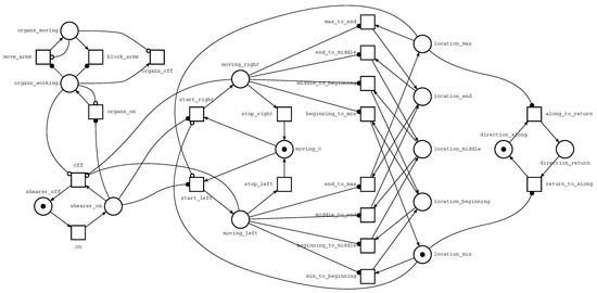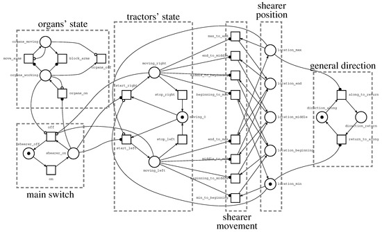 Figure 6. The main switch part represents the process of preparing the shearer to work. A token in place shearer_on denotes that all systems (parts of shearer) have been checked and are ready to work. The organs’ state submodel represents the behaviour of shearer arms and organs. Both organs are working or are disabled at the same time. The tractor’s state part models tractor’s behaviour. Three modes are possible: moving right, moving left or stoppage. The shearer position part represents the position of the shearer (see