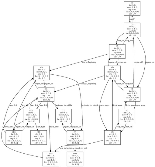 Finally, the place organs_moving is marked if at least one value of the attributes Right_Arm_Up, Right_Arm_Down, Left_Arm_Up and Left_Arm_Down is equal to true. The place organs_working is marked if arms are moving or at least one value of the attributes LDC, RDC is greater than 0.