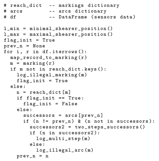 The analysis procedure is implemented using the Python programming language. Two main arguments for the script are the reachability graph generated by the TINA tool (the verbose version) and a CSV file that contains sensors data. The reachability graph is represented by two data structures (two Python dictionaries). The former takes a marking (tuple) as a key and returns its number in the reachability graph. The latter takes a marking number and returns the set of its successors in the reachability graph. The sensors readings are stored using the Pandas DataFrame. The data frame is extended to store the results of mapping records to the corresponding markings and its content is analysed using the two dictionaries. A simplified representation of the verification algorithm is presented in