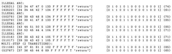 Table 4. There does not exist an arc leading from marking 74 to marking 61 in the reachability graph, and there is not a two-length path leading from marking 74 to marking 61. Thus, the change from marking 74 to 61 was logged as an illegal arc. After analysing the records, we can see that the shearer begins to move to the right, but its position changes as for moving to the left. It is obvious that this means an error in the data obtained from the shearer sensors.