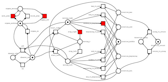 Figure 5. Let us focus on transition move_arms and places organs_working and organs_moving. The TINA software uses an empty-circle arrowhead to denote an inhibitor arc. Such an arc leads from place organs_moving to transition move_arms, which means that the place must be empty if the transition is enabled. We say that there is a self-loop on a given place