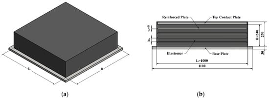 In order to validate the numerical simulation of the elastomer bearing, first, the shear modulus test according to EN 1337-3 was conducted. Next, finite element analysis was performed under the same conditions, and the results were compared. The size of the bearing model for the comparison is 800 × 800 × 200 mm, with a contact plate of 25 mm thickness at the top and bottom, and 3 reinforcing plates of 6 mm thickness between them. The details of the model are shown in Figure A1.