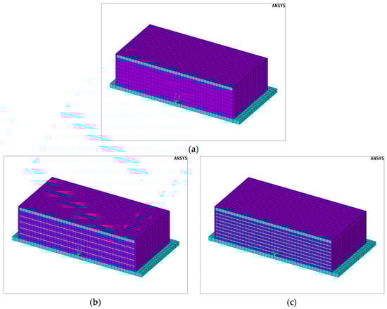 This is a figure of the half-domain finite element model for Analysis: (a) without reinforcing plate; (b) with 4-rows reinforcing plate; (c) with 8-rows reinforcing plate.