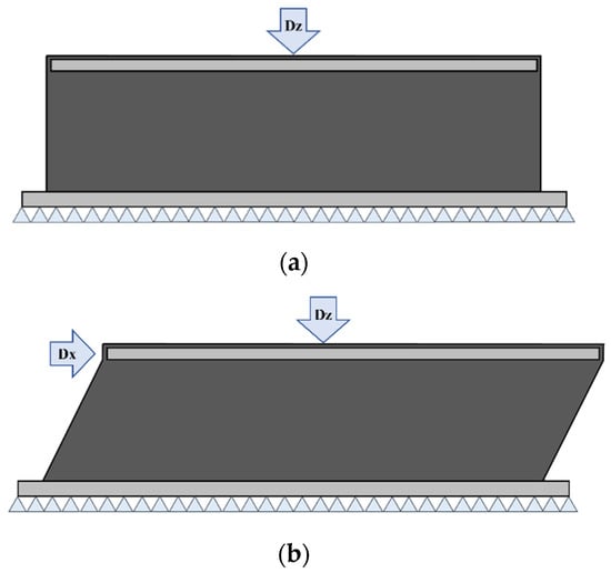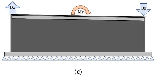 Top-side structures of fixed offshore platforms supported by elastomeric bearing typically accompany three forces, gravity force by weight, horizontal force and overturning moment by wind. In the case of floating platforms, inertia forces by platform motion also contribute to the above forces and moments [16,17]. In this study, to analyze the stiffness of the bearing under three load conditions, as shown in Figure 3, all degrees of freedom under the bearing foundation plate were fixed and symmetric boundary conditions were applied to the plane of symmetry. Since the elastomer is a nonlinear material, when a load is applied, it does not tend to converge. To obtain the converged value, the reaction force was calculated by applying the displacement of the upper part of the bearing, and then a load-displacement analysis was performed. To analyze the compressive stiffness in accordance with EN 1337-3, the marine elastomer bearing design standard, vertical load (Fz) was analyzed while increasing the vertical displacement (Dz) of the upper bearing by 1 mm from 1 to 5 mm to make the range of vertical loads overlap as the number of reinforcing plate increases. Moreover, the vertical displacement of FPSO elastomeric bearings is designed not to exceed 5 mm. The deformation remained vertical during the process. Subsequently, to analyze the shear stiffness of the bearing, a horizontal load (Fx) is applied by imposing a horizontal displacement (Dx) of 50 mm while a 3 mm vertical displacement (Dz) is applied to the upper part of the bearing. As for the bending stiffness, the bending moment (My) about the y-axis was analyzed by applying 0.005 rad of rotation angle (θy) about the y-axis to the upper contact plate.
