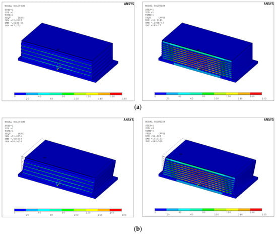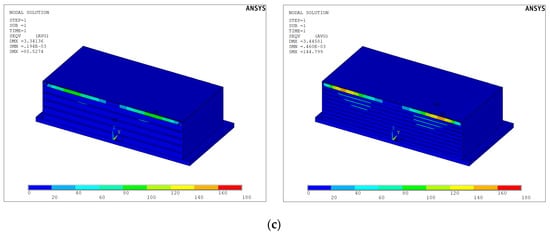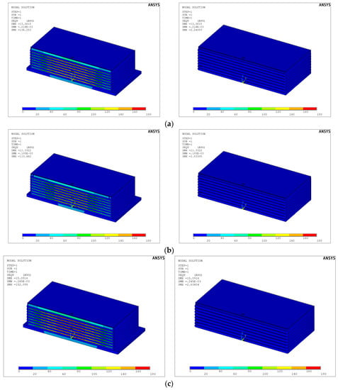 This is a figure of the stress distribution of two bearing models with 4-row (left figure) and with 8-row reinforcing plate (right figure): (a) Compression (when vertical displacement is 3 mm); (b) Shear (when horizontal displacement is 50 mm); (c) Bending (when rotation angle is 0.005 rad).