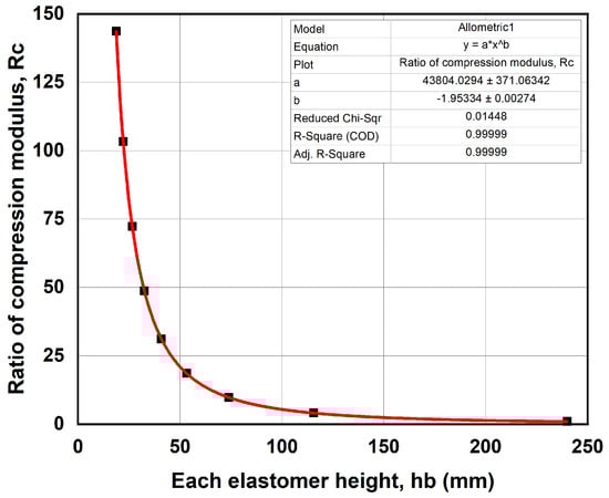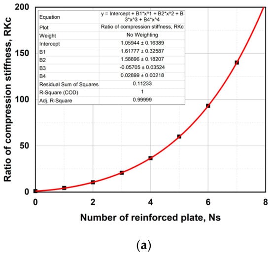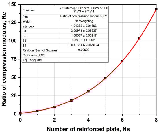 In Figure 5, the compressive modulus ratio (Rc) according to the number of reinforcing plates (Ns) is expressed as a quadratic equation using the least-squares method, as shown in Equation (3). Substituting Equation (3) into Equation (2) completes the compressive stiffness (Kc) equation with various numbers of reinforcing plates (Ns).