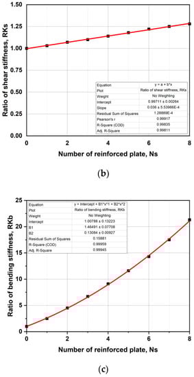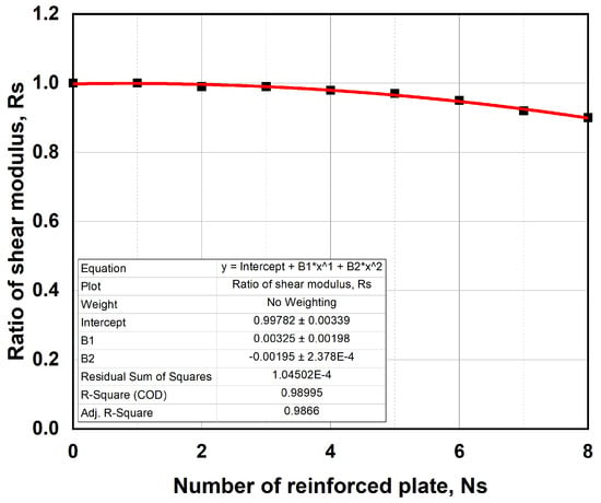 The shear modulus ratio (Rs) according to the number of reinforcing plates (Ns) is expressed as a quadratic equation using the least square method as shown in Equation (7):