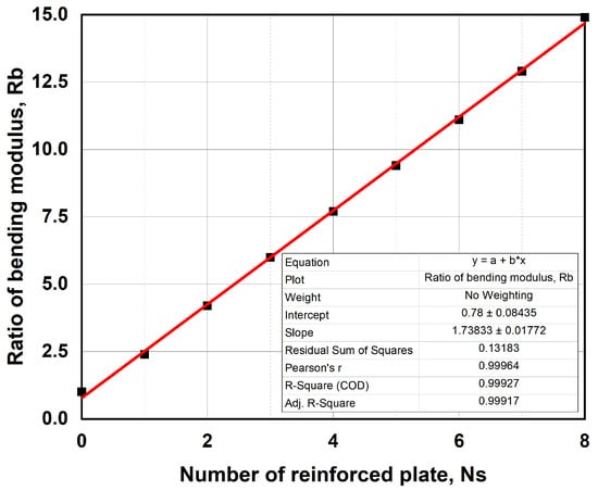When the moment of inertia (I) of the elastomer is (1/12) × 1012 mm4, the bending moment (My), bending stiffness (Kb), bending stiffness ratio (RKb = Kb/Kb0), bending elasticity (Eb), and the flexural modulus ratio (Rb = Eb/Eb0) were calculated and shown in Table 11. From Table 11, as the number of reinforcing plates (Ns) increases, the bending moment (My) significantly increases. Looking at the bending stiffness ratio (RKb), as the number of reinforcing plates increased, the bending stiffness (Kb) increased up to 21.3 times from 2025 kN-m/rad (0 plate) to 43,128 kN-m/rad (8 plates). In order to derive the empirical equation of the flexural modulus (Rb) according to the number of reinforcing plates (Ns), the data in Table 11 were fitted and the results are shown in Figure 8.