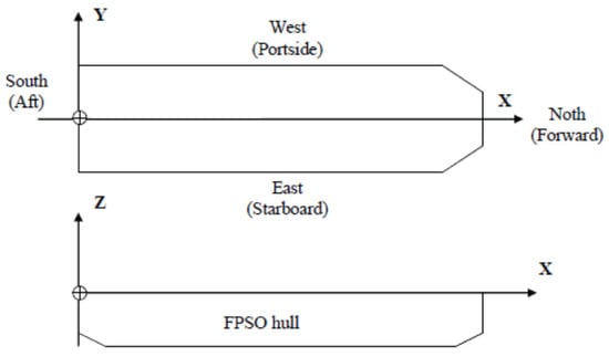 Based on the analysis of the effect of the reinforcing plates on the stiffness of elastomeric bearings, the design method is applied to a FPSO which is actually operated in the North Sea. The global axis system of the target FPSO is shown in Figure 10. Marine elastomeric bearings are to be designed to safely support the upper module under five load conditions: 1-yr Operate, 100-yr Extreme, 10,000-yr Abnormal, 1-yr Damage, and Transit (Tow) load conditions. These five load conditions are classified as ULS (Ultimate Limit States), ALS (Accidental Limit States), and SLS (Serviceability Limit States) according to the LRFD (Load Resistance Factored Design) Load Combination [19]. Table 14 shows the LRFD load combinations and the corresponding safety factor. Table 15 shows the loads and displacements acting on the elastomeric bearing for the FPSO for each load condition [14]. The elastomer bearing for the FPSO consists of vertical, horizontal, and anti-uplift bearings, and this section illustrates how the elastomer bearing can be designed as a vertical bearing. In Table 15, the highlighted sub-box is the load and displacement condition for the vertical bearing by load condition. It is seen that the maximum vertical loads are increased in harsh sea conditions due to the increase of vertical motions and the corresponding inertia forces.