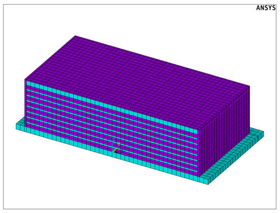 In Table 15, the vertical load (Fz) acting on the elastomeric bearing for the target FPSO has a value of 16.5–24.9 MN. This value is within the load range of the model with 7-row reinforcing plates as shown in Table 7. Therefore, the model with 7-row reinforcing plates can be selected as the subsequent analysis model. The dimensions of the selected analysis model are shown in Table 16. Since the geometric shape and boundary conditions are symmetric, meshing was performed only for the half domain. In the finite element model, 8-node brick elements with 3 degrees of freedom were used so that the size of one side was up to 25 mm. The half-domain finite element model of the vertical elastomeric bearing for the target FPSO is shown in Figure 11.