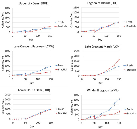 Maximum colony growth rates (between days 52 and 130) of 0.23 div day−1 were reached in freshwater grown LCRW and WML, while 0.22 div day−1 were reached in brackish BBUL, LCM, and LHD. No significant differences occurred in growth rate between the freshwater and brackish growth medium. All 36 cultures showed slower growth after 80 days, and most reached the stationary growth phase.