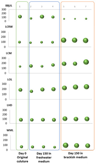 Figure 2 demonstrates the change of colony diameter and biovolume (size of sphere) in the growth of the six B. braunni strains in brackish water with a salinity of 4. All strains except BBUL showed significantly increased biovolume of colonies at a salinity of 4 at day 150. The possibility of cell division occurring in strain BBUL was dismissed due to the slow growth of this strain, and the culture was observed to be in stationary growth phase.
