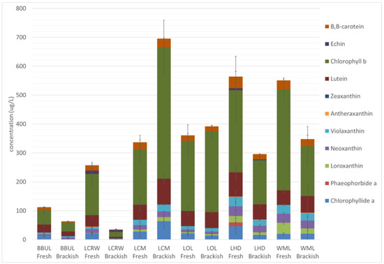 Figure 4 shows the Chlorophyll a (Chl a) content (µg/L) of the 6 Australian B. braunii strains. Higher Chl a values correlate with significantly better growth occurring for cultures (post inoculation to 30 mL) in fresh water medium than brackish medium (Figure 4). Total Chl a concentrations varied significantly between the fresh and brackish cultures as seen in strain LCRW, LHD, and WML (Figure 4). Figure 5 demonstrates the carotenoid pigment compositions of the six Australian B. braunii strains in this study. The Echinenone in both race B LCRW (11.4 ug/L) and LHD (7.3 ug/L) have generally higher values in the freshwater cultures compared to that of brackish water (6.9 and 3 ug/L, respectively).