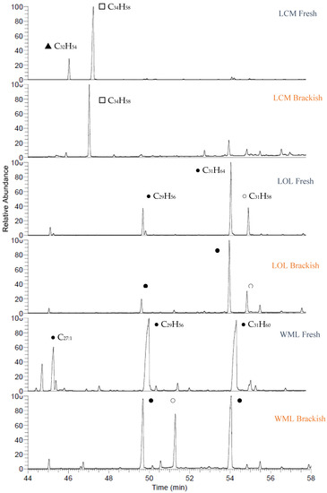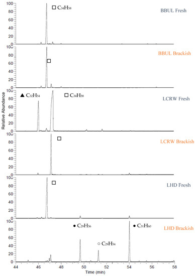 Figure 6 and Figure 7 are the partial gas chromatograms showing the major hydrocarbons identified in the 6 Australian B. braunii strains with both the freshwater and brackish medium treatments. Each race A strain had between 14 and 21 of the 22 different straight odd-chain alkenes identified; each race B strain had between 7 and 26 of the 37 different botryococcenes and methylated squalenes identified. Strains BBUL, LCRW, and LHD showed the characteristics of race B strains, which have predominantly botryococcenes and methylated squalenes (C30–C37 isoprenoids). Both BBUL and LCRW strains had no significant difference between the freshwater and brackish medium treatments (Figure 6), and strain LHD had a more dominant peak (C29) in the brackish treatment. Figure 7 shows the strains that have exhibited differences in their hydrocarbon profile due to the effect of the brackish treatment. Strain LCM is an unknown race, while C27 botryococcenes in the freshwater treatment of LCM are enhanced relative to the brackish treatment (Figure 5).
