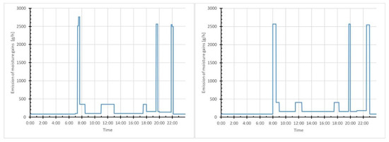 Assumed daily variations of moisture gains in unit M3 on work days (left) and weekends (right).