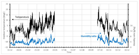 Having access to long-term metrological data, researchers can produce their own untypical meteorological years (UMY), i.e., variations in the Weather Year for Energy Calculations 2 (WYEC2) reference year calculated with nonstandard weighting indices. In such a situation, different weather parameters are more or less important during the selection of typical months [57]. It is possible to develop a specific UMY to model natural or hybrid ventilation systems. However, the need to compare results between studies encourages scientists to instead use measured meteorological data or standardized ISO or WYEC2 typical years. All analyses in the present study were performed using a typical meteorological year for Warsaw Airport Okęcie (52°10′ N; 020°58′ E), as published by the Polish Ministry of Infrastructure (https://archiwum.miir.gov.pl/media/51889/wmo123750iso.txt). This file complies with rules described in EN ISO 15927-4 [58]. According to this meteorological year, the ambient temperature in Warsaw ranged from −12 °C to +34 °C, while the spread of daily average temperatures was from −7 °C to +24 °C (Figure 3).