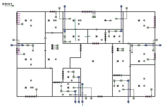 The performance of the considered ventilation systems was analyzed using the CONTAM computer program. The building and ventilation system was modeled as 97 zones, 715 flow paths, 56 ducts, and 126 junctions/terminals. Additionally, in humidity-based, demand-controlled hybrid ventilation systems, the model incorporated control elements to connect relative humidity with air vents, exhaust grills, and exhaust fans characteristics. A real control network is more complicated than what can be presented on a sketchpad, as some nodes represent subnetworks. Figure 4 presents the sketchpad (CONTAM) of the eighth floor of the analyzed building for Option 3.