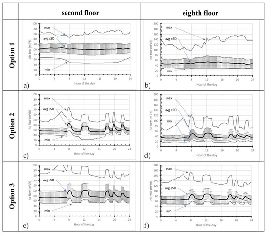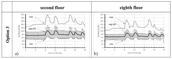 Figure 6 presents the airflows through unit M3 observed during workdays. For Option 1, the average air flows did not depend on the time of day. The average value for the second floor (approximately 110 m3/h) was only slightly lower than the required 130 m3/h. On the eighth floor, the average air flows were only 50 m3/h (38% of the requirement). The plotted lines showing average values +/− standard deviation and the maximum values indicated considerable variation in the intensity of ventilation depending on the weather.