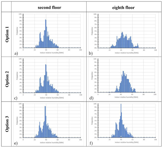 Comparison of indoor relative humidity histograms for units M3 located on the second and the eighth floors for the three considered ventilation systems. (a) Option 1 second floor; (b) Option 1 eighth floor; (c) Option 2 second floor; (d) Option 2 eighth floor; (e) Option 3 second floor; (f) Option 3 eighth floor.