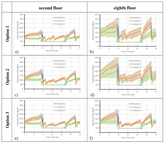 Comparison of exposures to CO2 in units M3 located on the second and the eighth floor for three optional ventilation systems (workdays). (a) Option 1 second floor; (b) Option 1 eighth floor; (c) Option 2 second floor; (d) Option 2 eighth floor; (e) Option 3 second floor; (f) Option 3 eighth floor.