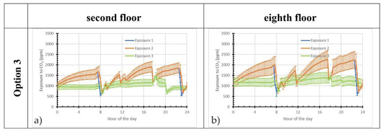 CONTAM allows users to simulate the presence of occupants within a building. It is possible to simulate occupant movements throughout the building and to determine each occupant’s contaminant exposure by integrating the contaminant concentrations to which the occupant is exposed [39]. Carbon dioxide is commonly used as a simplified indicator of IAQ. Unfortunately, this often done without fully taking into account the links between indoor CO2 and ventilation [59]. Nevertheless, this method was adopted in the present study. Figure 9 compares daily fluctuations of CO2 concentrations on workdays in units M3 located on the second and the eighth floor for three considered ventilation systems.