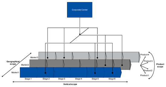 Organizational structure of a firm regarding the geographical, vertical, and product scope. Own illustration, based on [9] (pp. 348–351).
