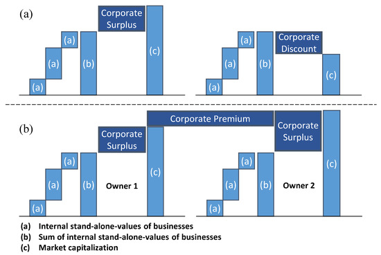 Schematic representation of the (a) corporate surplus and corporate discount and (b) corporate premium. Own illustration, based on [10] (pp. 52, 56).