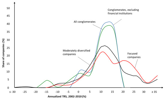 Distribution of total return for shareholders (TRS) for conglomerates, moderately diversified companies, and focused companies. Based on [12] (p. 3), adapted.