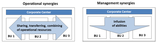 (ii) Management synergies. Management synergies are advantages that derive from certain abilities the corporate center owns and infuses into the BUs. Where operational synergies are based on the similarity or the complementarity of resources on the BU’s level, management synergies are based on the strategic fit between the abilities of the corporate center and the needs of the BUs. Examples for management synergies are the development of centers of excellence on the corporate level, such as for market research, mergers and acquisitions (M&A), and legal matters, or for innovation and growth, which can be used at the business level [10] (pp. 24–25; 354–355).