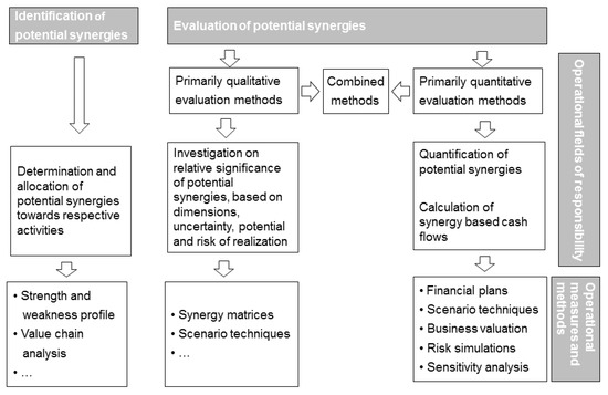 Starting on the left-hand side of Figure 6, the first potential synergies have to be determined and allocated towards the respective value-adding activities. This, for example, can be achieved by using the method of value chain analysis (cf. [14]). The result of this determination could be a list, classifying potential synergies according to [10] (pp. 369–376). The next step is the qualitative evaluation of the synergies found. At this step, the relative potential of the synergies has to be compared in order to find the main value drivers; also, the risk of non-realization should be evaluated here. One possible method for this qualitative evaluation is the use of a scenario technique. Proceeding to the right-hand side of Figure 6, finally, a quantitative evaluation should be performed. Rockholtz, Berens and Brauner [17] (pp. 190–192) suggests the use of financial plans in order to calculate synergy-based cash flows.