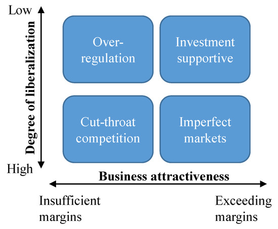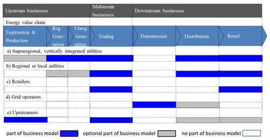While after liberalization of the German energy market in 2005, a process started in the late 1990s, eight supra-regional utilities existed at the beginning, after implementation of the unbundling directive only four supra-regional utilities, which owned the transmission network of their business areas, remained: RWE, E.ON, Vattenfall Europe, and EnBW [22] (p. 93). With the liberalization of the energy market and the unbundling legislation, the regulatory framework and thus market environment changed for all players. Figure 8 depicts the resulting generic business models.
