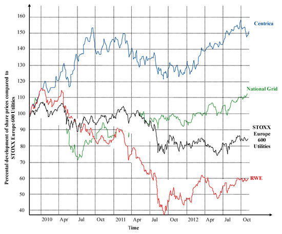 Figure 9 shows the relative development of the share prices of some selected utilities out of the above-discussed utilities in comparison with the STOXX® Europe 600 Utilities index from October 2009 to October 2012. The STOXX® Europe 600 Utilities index reflects the development of a representative portfolio consisting of selected European utilities, including all the above-mentioned ones except CEZ. Thus, the index reflects the overall development of the European energy market [35]. As can be seen in Figure 9, the general trend was that the diversified utilities, such as RWE, underperformed compared to the STOXX® Europe 600 Utilities index, while the two more focused companies, National Grid and Centrica, outperformed the index.