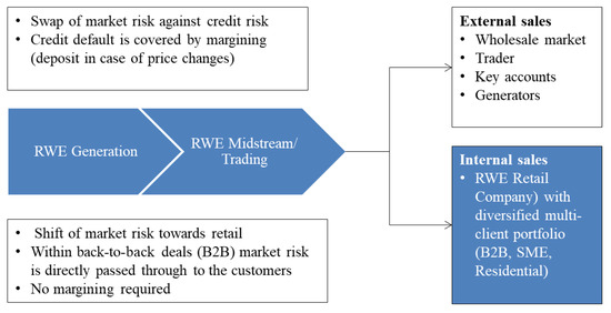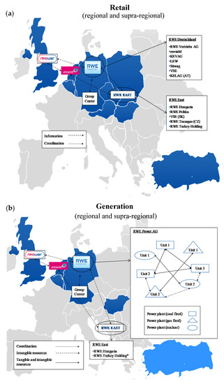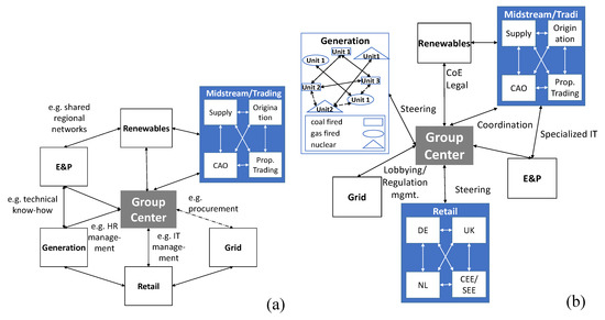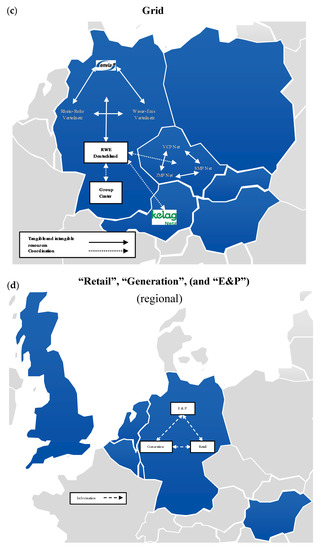 Due to the unbundling legislation, the supra-regional utilities (a) and upstreamers (e) had to separate the transmission networks from their remaining businesses. Management, administration, and information systems have to be set up separately, de facto leading to two separate firms (although these are still allowed to own the business). Utilities are generally still permitted to own local distribution networks, but these are now strictly regulated. Compared to the situation before the liberalization, additional players can compete in the market, namely, retailers (c) and grid operators (d). Grid operators are the only players in the market permitted to own and operate transmission networks. They have the option to also operate distribution networks, if desired. Their entire business is strictly regulated ([23], pp. 334–335; [24]). Due to the now non-discriminatory market access through regulated transmission and distribution grids, retailers can enter the market. The retailers’ BM is characterized by their focus on final consumers without owning or operating their own generation facilities. Therefore, retailers need to act in the energy trading business in order to procure their energy supplies from energy traders, such as upstreamers, supra-regional, or local utilities. While in the monopolistic market, prior to liberalization, participation in distribution and retail business were an option, supra-regional utilities forward-integrate towards the final consumer in order to secure their assets and businesses, especially against retailers. In addition, where trading in the monopolistic market only takes low effort, trading in a liberalized market with new competitors is highly sophisticated [22] (pp. 98–99). However, whereas—shortly after market liberalization had started—supra-regional utilities tended to integrate along the energy value chain, at the same time many of them refocused on their core competences, selling parts of their conglomerates.