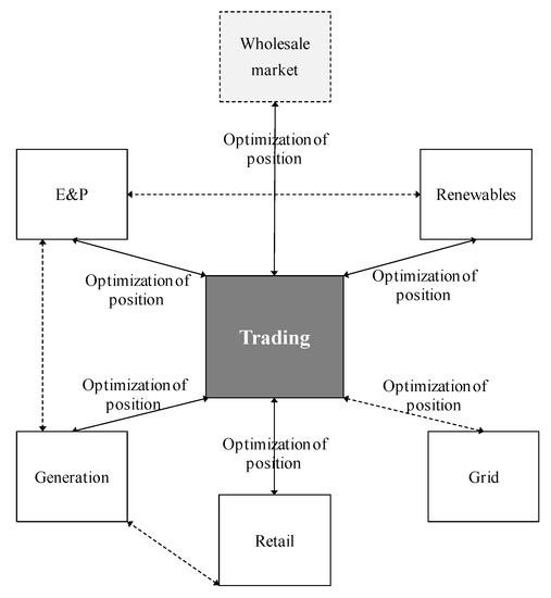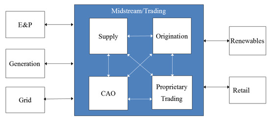 The value chain in the energy market can generally be divided into three business areas: upstream, midstream, and downstream. The upstream businesses include all operations performed in order to generate secondary energy, which—in the discussed case of grid-bound energies—is electricity or gas. Exploration and production (E&P) refer to crude oil and natural gas, which can often be (co-) produced from the same field or location. Generation refers to the generation of electricity. The midstream businesses include all kinds of energy trading, encompassing short- and long-term contracts, over-the-counter and standardized energy exchange deals, supply, origination, proprietary trading, etc. All operations of energy transmission, distribution, and retail to the end consumer are considered as downstream businesses.