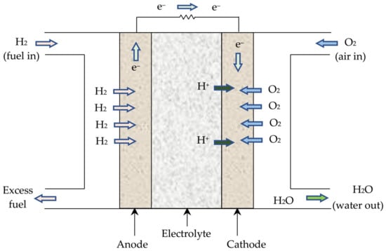 The initial prototype of a fuel cell was developed in 1839 based on an electrolysis experiment. A variety of fuel cells are available based on the type of electrolyte, such as the proton exchange membrane fuel cell (PEMFC), phosphoric acid fuel cell (PAFC), solid oxide fuel cell (SOFC), alkaline fuel cell (AFC), molten carbonate fuel cell (MCFC), etc. The fuel cell is one of the cleanest devices for electrical power generation. The efficiency of fuel cells is relatively high, and they can be used in a wide range of temperatures. Among them, the PEMFC, AFC and PAFC can be operated at low temperatures (50–250 °C), whereas the SOFC and MCFC are high-temperature fuel cells (650–1000 °C). A high-temperature PEMFC has recently been developed with the combination of polybenzimidazole membrane and phosphoric acid through doping. This unique feature allows the high-temperature PEMFC to perform its operation at a temperature of 200 °C. The efficiency of fuel cells lies between 40–60% depending on types, but it can be achieved up to 85% through cogeneration. Due to the low operating temperature, PEMFCs are not suitable for cogeneration cycles []. Cogeneration is an approach for electricity production by combining heat and power. The static operating nature of a fuel cell has made it quiet and vibrationless. The fuel cell is a suitable device due to its various amenities, such as high efficiency, zero emissions, simplicity, modularity and static nature. The fuel (input) of a fuel cell is not considered a renewable energy source. But hydrogen is universally available, which is used as fuel in a hydrogen fuel cell. Therefore, its popularity is increasing daily.