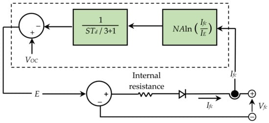 Fuel cells in portable applications offer numerous advantages over the conventional battery because of their outstanding properties and a 5 to 10 times high-power density than that of conventional batteries. Portable fuel cells have a wide range of power output starting from a few watts up to several kilowatts. Horizon, a manufacturer of a hydrocar educational kit, has already brought educational remote-control vehicles, toys, kits, and gadgets into the market. Fuel cell-based portable power generators are used for electricity generation where the grid connection is unavailable. The light-weight generator looks reasonable for outdoor personal uses, surveillance and emergency relief efforts. Fuel cell technology plays a significant role in stationary power generation sectors. A PEMFC equivalent circuit is shown in Figure 3, where two feedback loops (current feedback and voltage feedback) are used. Internal resistance additionally appears where the open-circuit voltage is denoted by V0C. To restrain the negative current flow into the system, a diode is employed in series with the output.