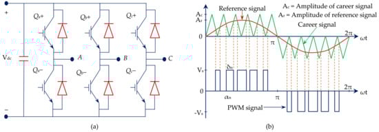 (a) Insulated gate bipolar transistor-based power inverter; and (b) Sinusoidal pulse-width modulation of one of the phases.