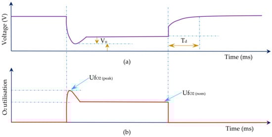 Figure 6 depicts the characteristics of the PEMFC at the starting and running conditions. At the starting point, voltage sag occurs for a while, and an overshoot in the oxygen (O2) utilisation is found. During running conditions, no significant variation in the voltage and O2 utilisation are observed. At the endpoint, the voltage reaches to its initial value after a time delay Td.