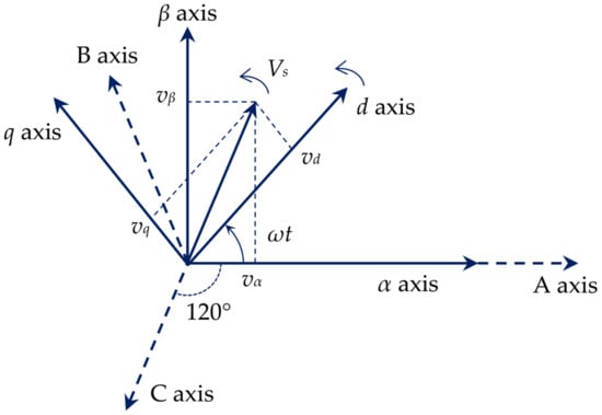 In Figure 7, 3-phase A, B, C voltage vectors in abc reference frame are transformed into the d-q-0 stationary reference frame system. The A, B and C represent three-phase voltage vectors where each voltage vector is electrically shifted by 120°. The abc-to-dq0 transformation depends on the d-q frame alignment at t = 0. The angular position of the rotating frame is presented by ωt.