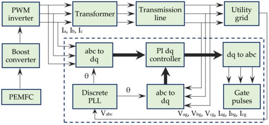 In this section, the functional block diagram of the complete PEMFC based power generation system is described with the simulation setup. In Figure 8, PEMFC was a proton exchange membrane fuel cell stack, which produced unregulated dc power. A boost converter raised the voltage level and supplies dc power to the PWM inverter. The inverter produced three phase-controlled ac power. A step-up transformer was used to step up the voltage, as required by the utility grid. The connection between transformer and grid is shown in Figure 8, where the dotted area presents the control block of the system. Load current and voltage were measured first. Then, by utilizing the Parks transformation, the abc-to-dq frame was determined. A three-phase discrete phase locked loop (PLL) was used to find the required phase angle (θ) of the grid voltage and synchronises the inverter’s output voltage with the grid voltage. Because the 60 Hz voltage frequency of the inverter and grid needed to be synchronised with maintaining θ, the PI controller was applied to produce the necessary gate pulses. An elaborate model of gate pulse is discussed in Figure 4a. The transformation, abc-to-dq axis worked like a reference signal of PI controller and measured the phase angle with the transmission line.