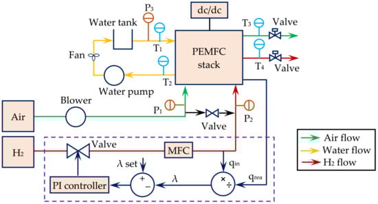 In Figure 9, a PEMFC system is shown with fuel cell stack, dc-dc converter, gas flow model, water pump, etc. Hydrogen gas flowed through a mass flow controller (MFC), which controlled the flow of hydrogen. At the same time, air was pumped into the cathode chamber with a blower. Then, the fuel cell stack provided dc power through an electrochemical reaction. A mechanical valve was used to drain the remaining gas. To keep the proper temperature inside the stack, water cooling system was used. Since PEMFC had a chamber with thin layers, high pressure can damage the stack. Therefore, it was important to monitor and regulate the pressure difference between anode and cathode chamber. Two valves were used at the back end of the gas pipe to regulate air and fuel pressures. P1, P2, P3 and P4 were the pressure sensor which measured flow pressure whereas, temperature measurement was performed with temperature sensors T1, T2, T3 and T4. The dotted area presents the fuel flow control structure, which marks the output of the PEMFC stack. It prevented fuel starvation at the time of load changing. Therefore, the stoichiometric ratio, λ can be expressed as the ratio of qin and qrea where qin was calculated from the feedback signal of MFC, and the load current was used to figure out qrea []. The PI controller was used to control the output of MFC.