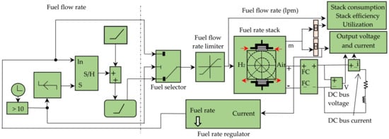 In the simulation setup, the connection between the PEMFC and the controller is illustrated in Figure 10. The fuel cell stack was the combination of 45 fuel cells, which were connected in series. In this system, fuel flow depended on the amount of current, while the relationship between fuel flow and current was proportional. The current sensor was used to calculate the amount of fuel required by the system in accordance with the current value. On the left side of Figure 10, an elaborated model of a fuel flow rate is shown. Fuel flow rate allowed a specific amount of fuel to flow where the unit was liter per minute (L/min or Lpm). The primary function of the fuel selector was to interface with the appropriate switch as per the required action. There were three switches in the fuel selector block. The fuel flow limiter interrupted the fuel flow during an excessive flow, and it allowed only the permissible amount of fuel to flow through it.