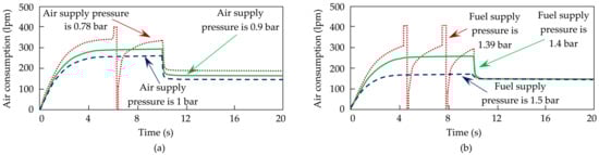 Air consumption for different: (a) air pressures; and (b) fuel pressures.