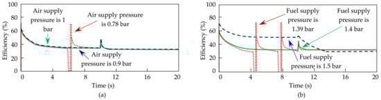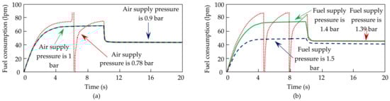 In Figure 12b, air consumption of the PEMFC for a constant air supply pressure of 1 bar with different fuel supply pressures is shown. It was observed that the system remained stable between 1.4 to 1.5 bars of fuel pressure, but the system became unstable when the fuel pressure was below 1.4. The fuel supply pressure, unlike the air supply pressure, had an impact on both the system’s fuel consumption and efficiency performance. These simulation outcomes are shown in Figure 13b and Figure 14b, respectively. From the plotted graphs, it was found that the outputs were distorted when fuel pressure was below 1.4 bar, and the system became unstable. According to the simulation results, when the air supply pressure was set to 1 bar, the optimum value of the fuel supply pressure was 1.4 bar.