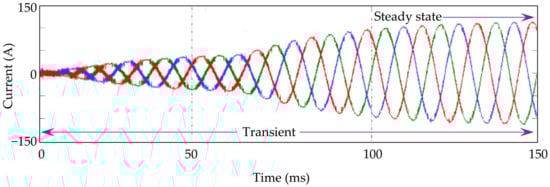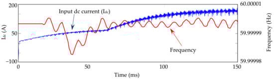 The turns ratio of the transformer was 1:12 so that it could step up the output ac voltage of the inverter to 480 V. This design supported the supply of ac power to the local grid successfully. Voltage waveforms were adequately smooth because of applying the correct, current control method, as shown in Figure 11. As shown in Figure 16, the current flow was controlled by a PI controller. For this reason, the instantaneous value of the current waveform was always changing because of the feedback circuit. The proposed controller took an interval of a few cycles to reach the steady-state condition. This was due to the action of the rate limiter with an appropriate PI gain that prevented the feedback system from becoming unstable. The voltage frequency of the proposed system was maintained at 60 Hz with a limited tolerance, as plotted in Figure 17. The input dc voltage of the inverter was controlled by a dc current controller (Figure 17) so that the common dc link voltage could be maintained. The overshoot and damping were controlled by applying appropriate gains of the feedback system.
